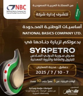 تتشرف شركة أساسيات الوطنية المحدودة (NBC) من المملكة العربية السعودية بدعوتكم لزيارة جناحها F1 في القاعة 1 في معرض سوريا الدولي للبترول والطاقة والثروة المعدنية “سيربترو 2025″، الذي يقام برعاية وزارة الطاقة السورية وتنظمه مجموعة المشهداني الدولية على أرض مدينة المعارض في دمشق.