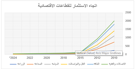 | السنة | الزراعة | الصناعة | السياحة | النقل والمواصلات | الطاقة | الاتصالات والتقنية | الإجمالي التقريبي |