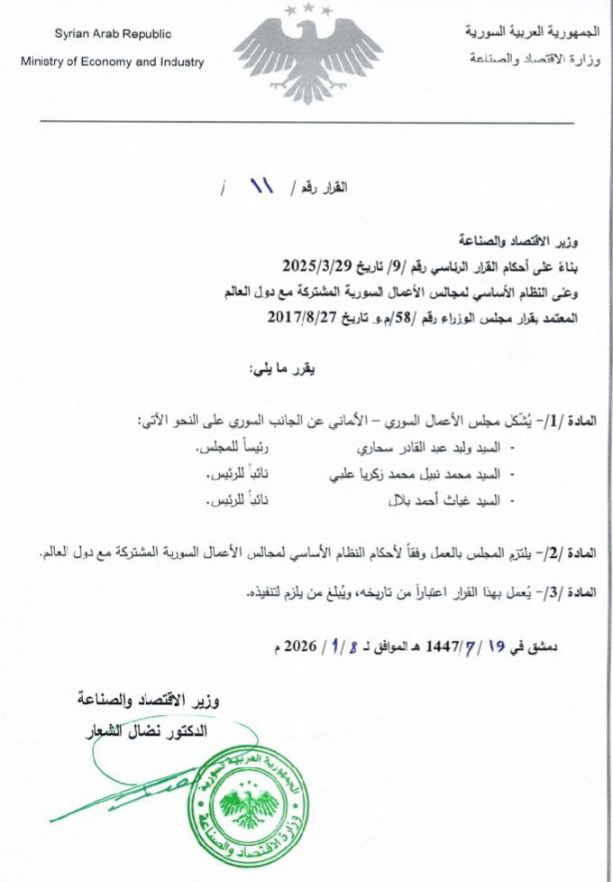 أصدر وزير الاقتصاد والصناعة نضال الشعار قراراً بتشكيل مجلس الأعمال السوري الألماني، وذلك في إطار تعزيز التعاون الاقتصادي بين سوريا وألمانيا.