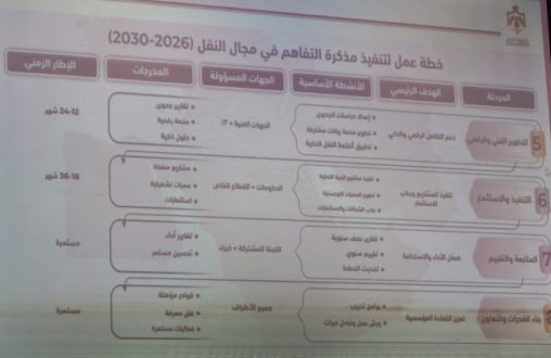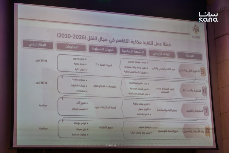 وزير النقل السوري يعرب بدر أكد أن مذكرة التفاهم تتضمن خارطة طريق واضحة تحدد الأنشطة المطلوب تنفيذها على مستوى مؤسسات النقل في الدول الثلاث، ضمن برنامج زمني للمتابعة يمتد لثلاث سنوات.