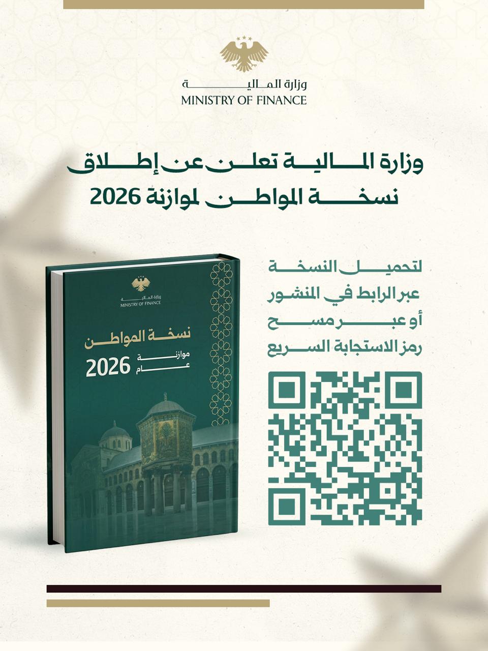 وقال برنيه في مؤتمر صحفي بدمشق: “نسخة المواطن لموازنة 2026 هي وثيقة مالية مبسّطة تهدف إلى تلخيص وشرح أبرز المعلومات الأساسية المتعلقة بالموازنة العامة للدولة للعام المالي 2026م، وذلك في إطار التزام الحكومة بتعزيز الشفافية وتوسيع قنوات التواصل مع المواطنين”.