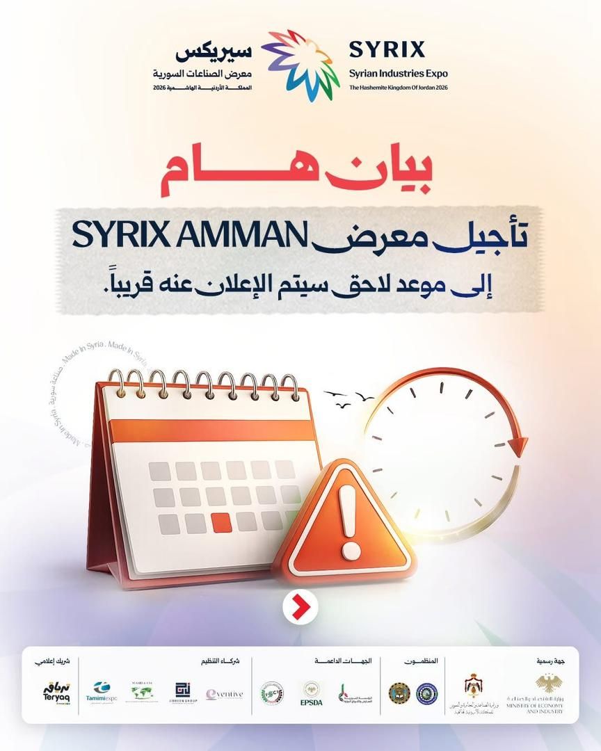 أعلنت اللجنة المنظمة لمعرض سيريكس SYRIX AMMAN – “معرض المنتجات السورية في عمّان” تأجيل المعرض إلى موعد لاحق سيتم الإعلان عنه قريباً، وذلك في ضوء الظروف الراهنة في المنطقة التي تشهدها.