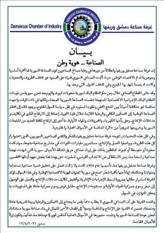 وقالت الغرفة في بيانها:” انه بعد تحرير سوريا تنفست الصناعة الوطنية الصعداء، لكنها في ذات الوقت، واجهت منافسة غير متكافئة أحياناً بين المنتج المحلي ونظيره المستورد في ظل سياسة السوق المفتوح”، معيدة سبب ذلك إلى افتقارها إلى التمكين الكافي والرعاية اللازمة خلال فترة الثورة، إضافة إلى الارتفاع الكبير في تكاليف ومدخلات الإنتاج، وعلى رأسها الكهرباء والمحروقات والمواد الأولية، ما أدى إلى ارتفاع تكلفة العديد من المنتجات – السورية وخروجها تدريجياً من دائرة المنافسة في الأسواق المحلية والخارجية.