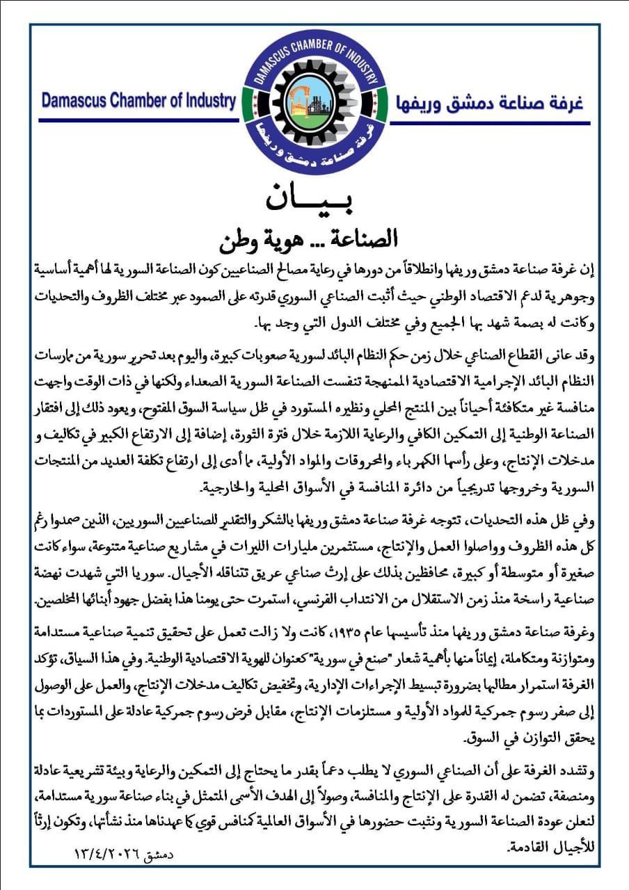 وشددت الغرفة: ” أن الصناعي السوري لا يطلب دعماً، بقدر ما يحتاج إلى التمكين والرعاية وبيئة تشريعية عادلة ومنصفة، تضمن له القدرة على الإنتاج والمنافسة، وصولاً إلى الهدف الأسمى المتمثل في بناء صناعة سورية مستدامة لنعلن عودة الصناعة السورية ونثبت حضورها في الأسواق العالمية كمنافس قوي كما عهدناها منذ نشأتها، وتكون إرثاً للأجيال القادمة“.